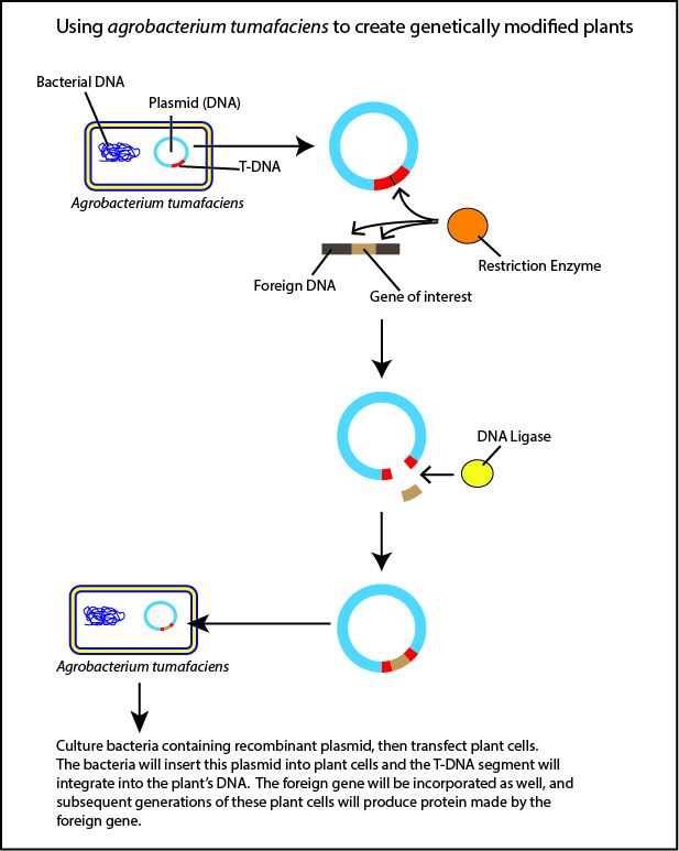 The most commonly used plasmid for genetic engineering in plants is called a Ti plasmid, produced in a bacterium called Agrobacterium tumefaciens.  In the wild, Agrobacterium can infect plant cells with the Ti plasmid, which acts as a sort of retrovirus in plants.  A section of the plasmid DNA called T-DNA integrates into the plant DNA and produces a series of proteins that cause tumors in the plant.  For obvious reasons the part that causes disease in the plants is removed, rendering it safe for genetic manipulation.  Scientists can then use what’s called a restriction enzyme, usually isolated from E.coli or other bacteria, that cuts specific sequences of DNA and combine it with a suspension containing the Ti plasmid.  Meanwhile, separately repeating a similar process with the foreign DNA containing the gene that you want expressed in the plant.  Combine these two solutions with another enzyme called DNA ligase, which “stitches” the DNA back together, resulting in the Ti plasmid containing the foreign gene of interest within the T-DNA.  Then, the plasmids can be reintroduced into Agrobacterium that will be used to infect cultured plant cells with T-DNA.  This is now called a transgene, a gene transferred from one organism to another.  The Infected cultured cells can then be selected and used to generate a new plant containing the inserted gene.  I summarized this process in the figure on the right.